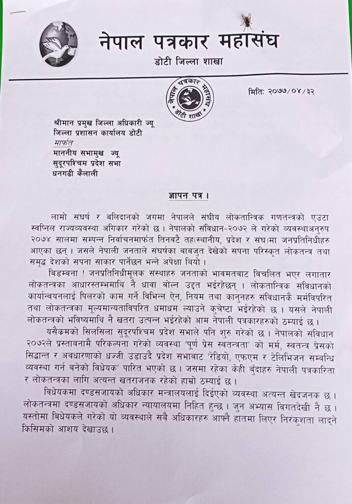 डोटी- नेपाल पत्रकार महासंघ डोटीले प्रदेश सरकारले पारित गरेको एफएम रेडियो तथा टेलिभिजन सम्बन्धी विधेयक सच्याउन माग गर्दै ज्ञापन पत्र बुझाएको छ । महासंघले आईतबार जिल्ला प्रशासन कार्यालय मार्फत सुदूरपश्चिम प्रदेश सभाका सभामुखलाई ज्ञापन पत्र बुझाएको हो ।