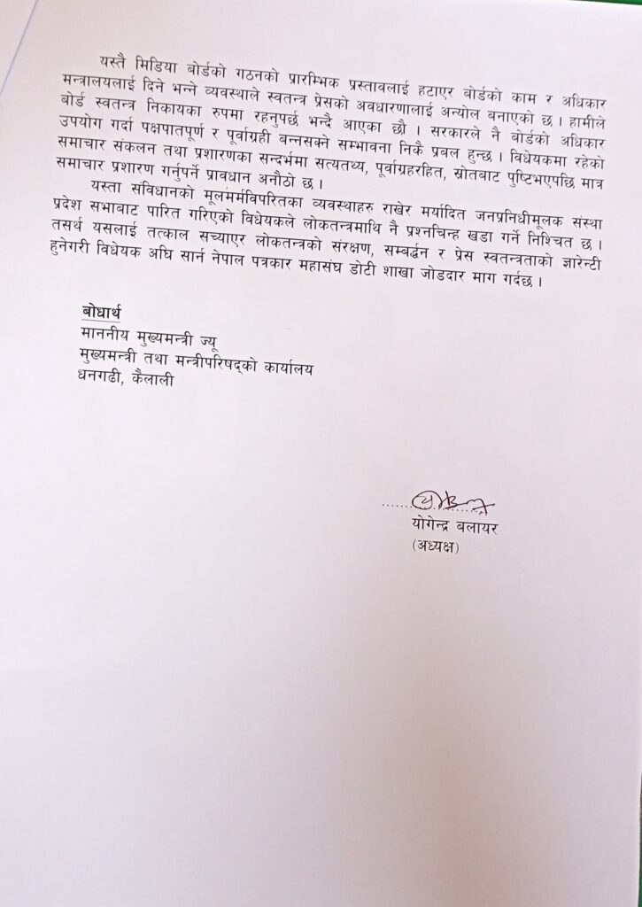 महासंघका अध्यक्ष योगेन्द्र बलायरद्वारा हस्ताक्षर गरिउको ज्ञापन पत्रमा सुदूरपश्चिम प्रदेश सरकारले नेपालको संविधान २०७२ ले प्रस्तावनामै परिकल्पना गरेको व्यवस्था ‘पूर्ण प्रेस स्वतन्त्रता’ को मर्म, स्वतन्त्र प्रेसको सिद्धान्त र अवधारणाको धज्जी उडाउदै प्रदेश सभाबाट ‘रेडियो, एफएम र टेलिभिजन सम्बन्धि व्यवस्था गर्न बनेको विधेयक’ पारित गरेकोमा आपत्ती जनाएको छ । महासंघले विधेयकमा रहेका केही बुँदाहरु नेपाली पत्रकारिता र लोकतन्त्रका लागि अत्यन्त खतराजनक रहेको जनाएको छ ।