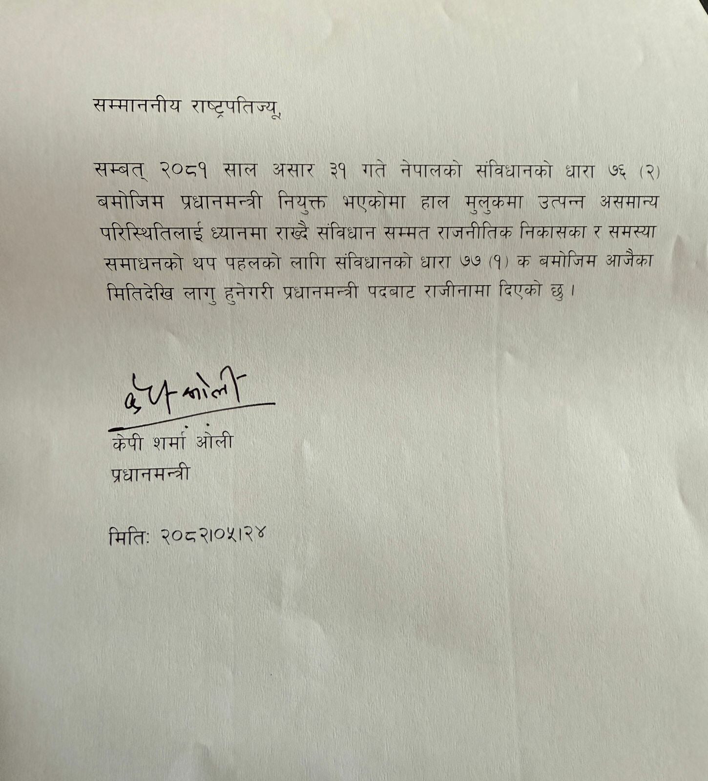 ‘२०८१ साल असार ३१ गते नेपालको संविधानको धारा ७६ (२) बमोजिम प्रधानमन्त्री नियुक्त भएकोमा हाल मुलुकमा उत्पन्न असमान्य परिस्थितिलाई ध्यानमा राख्दै संविधान सम्मत राजनीतिक निकासका र समस्या समाधनको थप पहलको लागि संविधानको धारा ७७ (१) क बमोजिम आजैका मितिदेखि लागु हुनेगरी प्रधानमन्त्री पदबाट राजीनामा दिएको छु,’ प्रधानमन्त्री ओलीले राजीनामा दिँदै भनेका छन्।