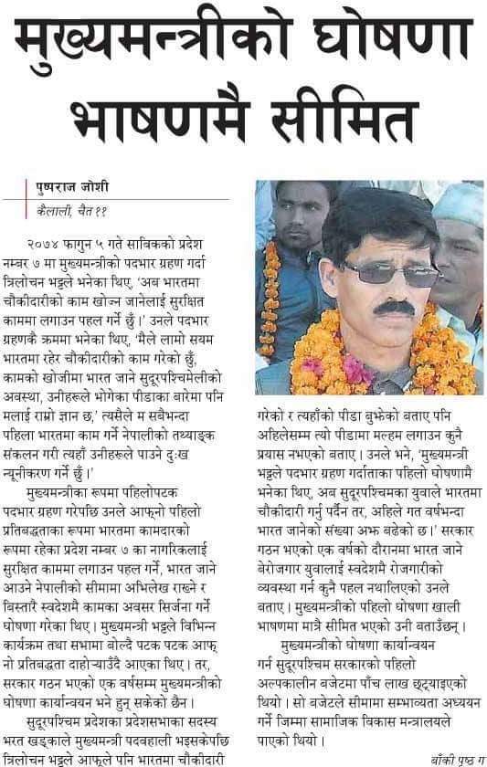 एक कार्यक्रममा मुख्यमन्त्री भट्टले प्रदेशमै रोजगारीको अवसर सृजन गर्ने, कसैले पनि भारत लगायतका देशमा गयर अपमानित हुँदै काम गर्नु पर्ने अवस्था नआउँने समेत बताएका थिए । तर अहिले रोजगारीको अवसर त कहाँ हो कहाँ कोरोनाको त्रास, भारतमा व्यरोजगार भएर नेपाल फर्किएका युवारुहलाई नेपाल प्रवेश तथा सुरक्षित क्वारेण्टाइनमा समेत राख्न नसकेको अवस्थाले बैदेशिक रोजगारमा गएका सुदूरपश्चिमेलीहरु माथी समेत अप्रिल फुल बनाइएको छ । अहिले नेपाल प्रवेश गर्न नपाएका जनताहरु सिमापारी बाट गाली मागी रेकाछन् । छाती थापिरहेका छन् । यसले प्रदेश सरकारको असक्षमता प्रष्ट पारेको छ ।