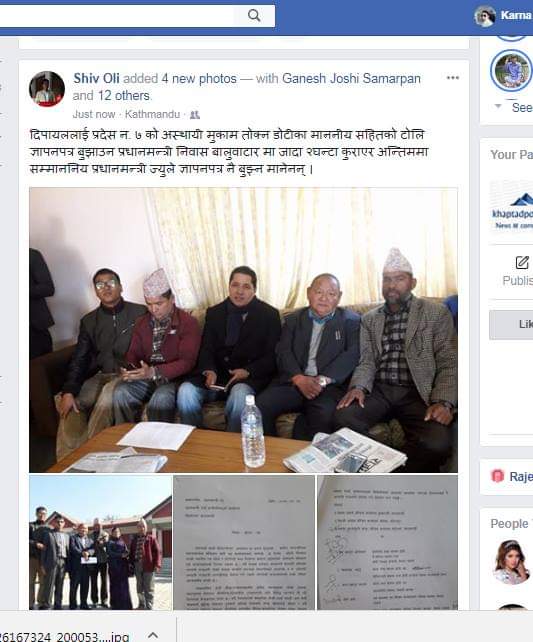 काठमाण्डौंमा राजधानि दिपायल बनाउँने माग राख्दै तत्कालीन प्रधानमन्त्री शेर बहादुर देउवाको निवास पुगेर मुख्यमन्त्री लगायत धेरै नेताले सेल्फि र फोटो खिच्न थाले । फोटो फेसकुकमा टास्दै देउवाले दिपायल राजधानिका बिषयमा ज्ञापन पत्र बुझ्न नमानेको ढोल समेत पिटियो । उनिहरुका लागि यो ठुलो अवसर थियो । राजधानीमा माननिय प्रेम आले, माननिय त्रिलोचन भट्टको नेतृत्वमा राजधानि दिपायल बनाउनु पर्छ भन्दै दबाबमुलक कार्यक्रम पनि गरियो । कार्यक्रमलाई फेसबुकमा लाइभ ठोक्न पनि भ्याए । यो घटनाक्रम सम्म भट्ट प्रदेश सांसद मात्रै थिए ।