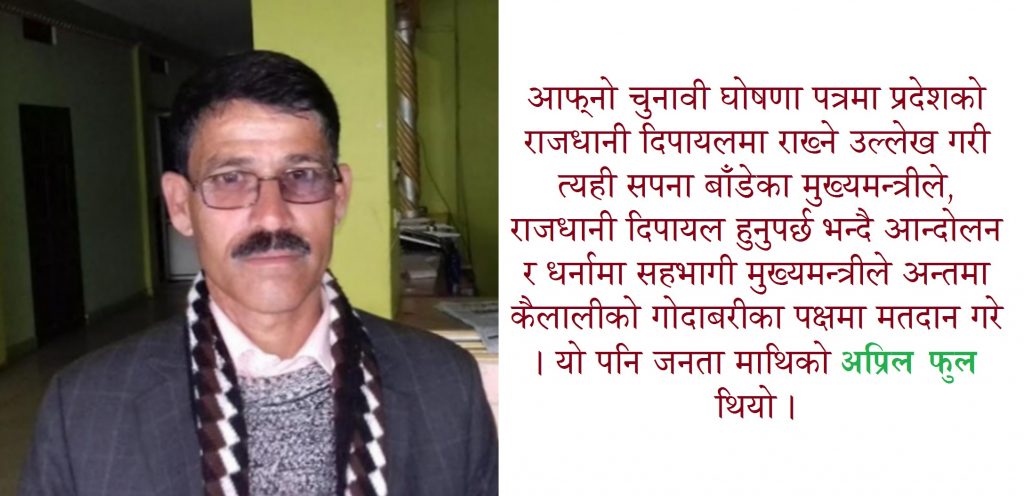 आफ्नो चुनावी घोषणा पत्रमा समेत प्रदेशको राजधानी दिपायलमा राख्ने उल्लेख गरेका र त्यही सपना बाँडेका मुख्यमन्त्रीले अन्तमा कैलालीको गोदाबरीका पक्षमा मतदान गरे । यो पनि मतदाता माथिको अप्रिल फुल थियो । मतदाताका घरघरमा गएर राजधानी दिपायल तोक्ने र तोक्न नसके पद त्याग गर्ने उनको घोषणा आफैमा अप्रिल फुल थियो ।