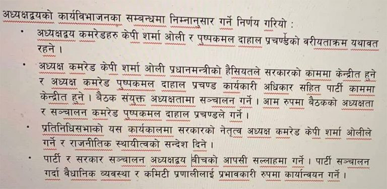 ‘पार्टीको बैठक संयुक्त अध्यक्षतामा सञ्चालन गर्ने, आमरूपमा पार्टी अध्यक्षता र सञ्चालन कमरेड प्रचण्डले गर्ने’ भनेर लेखिएको थियो।